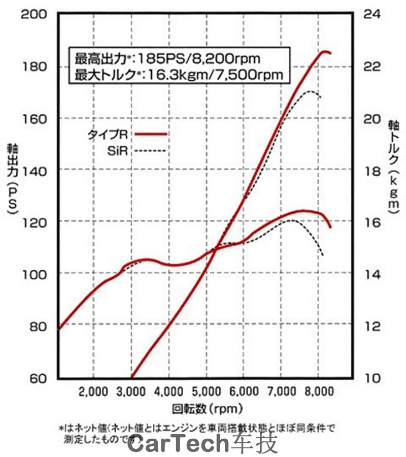 从发动机外部特性曲线也可以看出,B16b在8200rpm的转速爆发出最大功率,而功率曲线的抬升斜率从5000rpm开始明显上扬,并一直持续到了8000rpm并无明显衰减,这样夸张的出力曲线已经让同时期的买菜车发动机相形见拙。
