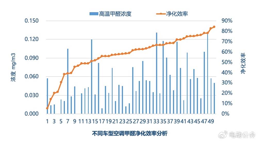 发现七:高温是室内甲醛加速挥发的“催化剂”,开空调是理想降醛手段。测评结果发现,高温环境下,车内甲醛平均释放浓度为0.056 mg/m3,较常温环境增长1.5-6.7倍,平均增长3.32倍,开启空调可以有效降低车内有害气体浓度。不同车型的空调净化能力差异较大,净化效率分布在5%-84%之间,平均空调净化效率为57.5%,净化效率最大可差16倍。