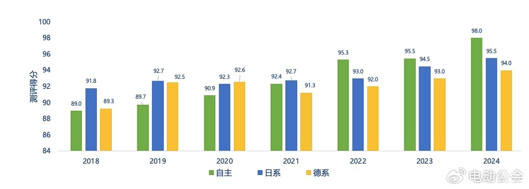 发现一:从追赶到引领,自主品牌车内空气质量改善明显。测评结果显示,各系别车型近7年在车内空气质量方面均有一定改善,平均提升率达到6.47%。值得关注的是,自主品牌车型自疫情后得分赶超德系、日系等合资品牌并持续领跑,跻身全球车内空气健康一阵营,整体得分优于合资品牌约2.2%。