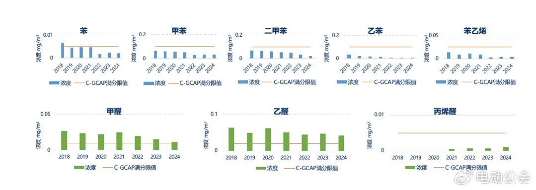 发现六:五苯三醛浓度控制得到明显重视,苯类优化明显,醛类仍需提升。五苯三醛被视为车内空气“隐形杀手”,车企为降低五苯三醛等挥发物含量进行持续的努力。测评结果印证了车企的努力已显成效,五苯三醛平均浓度逐年下降,其中,苯类物质浓度改善明显,2024年较2018年,车内苯系物浓度平均降低约68.8%。需要注意的是,甲醛仍是需要重点关注的重点问题。
