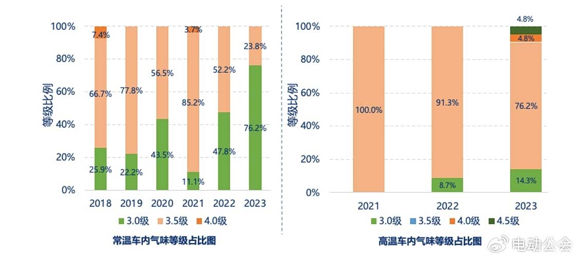 发现八:车内气味等级主要集中在3.0-3.5级水平,高温气味需要重点关注。测评结果显示,主流乘用车常温车内气味水平集中在3.0-3.5级,2018-2023年测评车型常温气味3.0级占比呈逐年上升趋势,高温状态下车内气味强度劣化较为明显,自2021年启动高温气味评价以来,高温场景下的车内气味受到了明显关注,但高温气味提升尚不明显。
