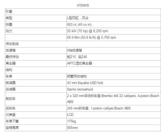 前后刹车使用的都是Brembo,前刹车是Brembo M4.32四活塞卡钳、搭配320mm浮动刹车盘。后刹车是Brembo单活塞卡钳、搭配230mm刹车盘。并且轮胎标配的是Pirelli Diablo Rosso II,运动性能和安全都有保障