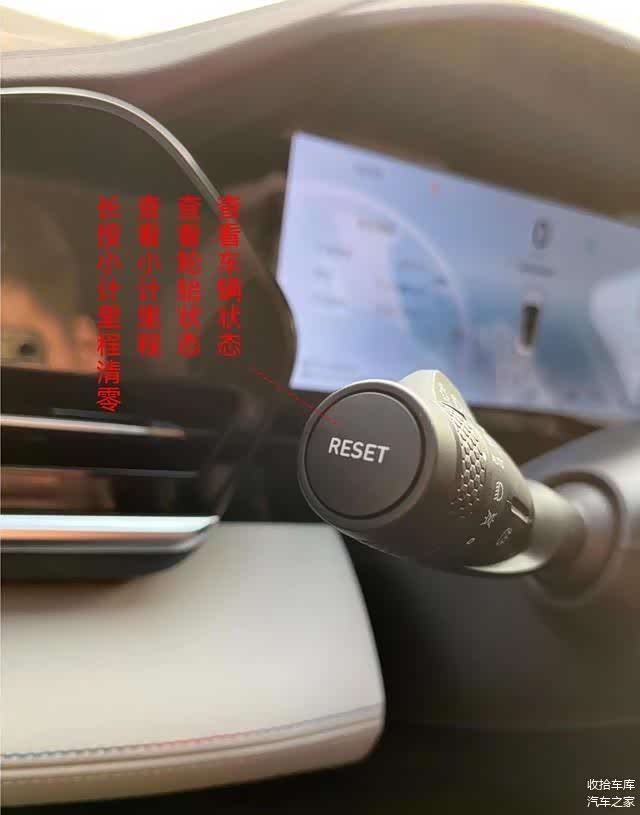 左边拨杆顶端还有一个按键,这个按键主要是切换仪表盘内容显示的。可以查看车辆里程、状态、胎压等。长按可以重置数据。