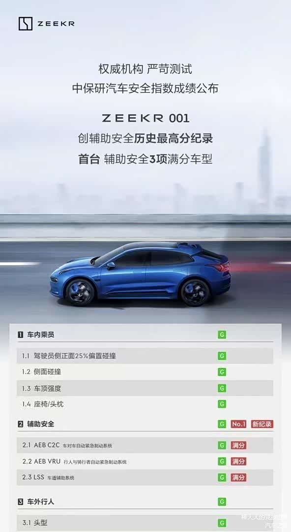 根据测评结果,我们一眼就能看到 极氪001(图片 | 参数 | 询价),拥有12个大G(优)评级,创辅助安全历史最高分纪录,并且唯一在车对车自动紧急制动系统(AEB C2C)、行人与骑行者自动紧急制动系统(AEB VRU)、车道辅助系统(LSS),这三项辅助安全测试项目中获得满分。那么,极氪001取得如此优异成绩的背后是如何付出的呢?