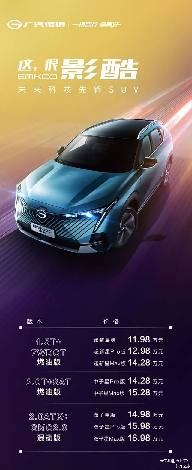 前不久,广汽传祺的全新车型—— 影酷(图片 | 参数 | 询价)正式上市,新车定位精品紧凑型SUV,竞争对手锁定吉利星越L与未来将要上市的博越L。此次上市,影酷一共推出了8款车型,售价区间11.98万-16.98万,在这么多车型里有1.5T燃油、2.0T燃油以及2.0L混动三种不同的版本,让很多计划购买影酷的用户犯了难,下面我们就一起去分析一下,影酷的8款车该如何选。