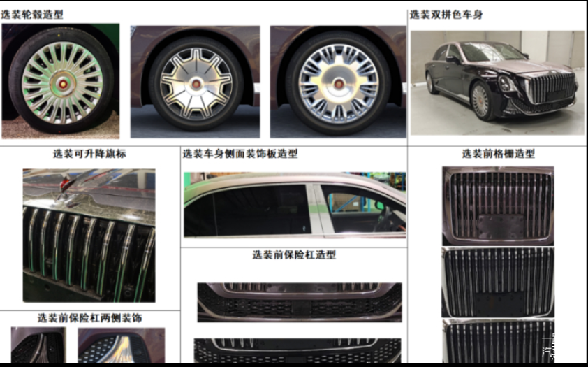 从设计上来看,车头采用了多组竖排格栅,风格结合了L5与H9的特点,同时车顶部有可升降的“LOGO”,给人劳斯莱斯般的豪华感。大灯采用全新布局,梯字型设计配合三层独立式光源,展现出独特的美感。车身尺寸为长5353毫米、宽1998毫米、高1511毫米,轴距为3260毫米,提供4座和5座车型可选。