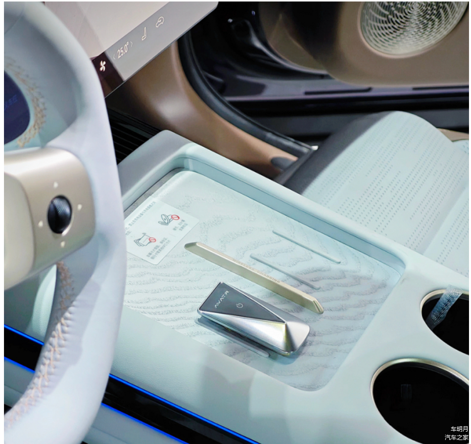 阿维塔07的内饰设计简约而不简单,每一个细节都透露着匠心独运。中控台下方采用了巧妙的镂空设计,不仅提升了空间的利用率,还使得整个驾驶舱显得更加宽敞明亮。上部配置的无线充电平台,更是考虑到了现代人对移动设备的依赖,可以同时为两部手机提供便捷的充电服务。