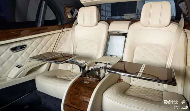 后排采用面对面四座设计,在这辆汽车的后排配有稀有木材打造的折叠小桌板,打开后可以放置笔记本电脑等办公用品满足日常需要,除此之外还配备了四只手工水晶香槟杯,以及特制的酒柜和冰箱,让你在路途中可以和朋友们一起在车内找点乐子。