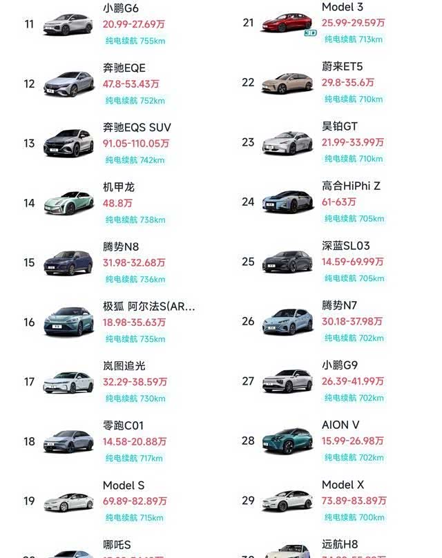 然后是11-30名,小鹏G6排名第二十一位,纯电续航为755km,奔驰EQE、奔驰EQS SUV和机甲龙的续航表现还算不错,都超过了700km,腾势N8、零跑C01 、Model 3、蔚来ET5和腾势N7这些热销车型也都有不错的续航表现,深蓝SL03排名第25位,纯电续航为705km。