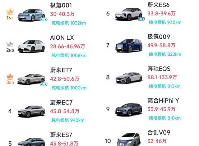 详细来看,极氪001以1032km夺得了纯电续航的榜首,埃安AION、蔚来ET7续航超过了1000km,蔚来EC7、蔚来ES7、极氪009和奔驰EQS续航超过了800km,属于同级别优秀水平。高合hiPhi Y排名第9位,纯电续航为810km,合创V09进了前十名。
