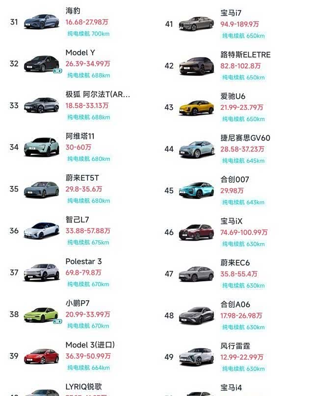 然后是31-50名,比亚迪海豹排名第31位,纯电续航为700km,Model Y、阿维塔11、蔚来ET5T和智己L7的续航接近700km。凯迪拉克LYRIQ锐歌排名第40位,纯电续航是653km,爱驰U6、合创007、合创A06和风行雷霆这几款自主品牌纯电车型也都进了前五名,纯电续航超过了600km。总得来说,现在的纯电车型确实续航表现不错,但是除了续航更多还是应该提升充电速度。对于纯电车别乱买!最新续航排名公布:极氪001夺冠,ET7、EQS超800km。大家怎么看呢?