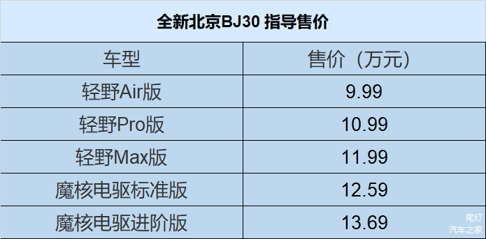 北京BJ30魔核电驱进阶版指导价13.69万,是全系唯一的四驱车型,也是动力最出色的车型,在发动机和前后双电机的加持下,它的系统综合功率和扭矩达到了301kW和685N·m,带有越野模式,配备涉水感应系统,其它配置和燃油顶配几乎一致(少了方向盘加热、氛围灯、负离子发生器)。综合来看,魔核电驱进阶版车型在配置到位的情况下,提升了动力,增加了可玩性,同时价格的提升也相对合理,值得推荐。