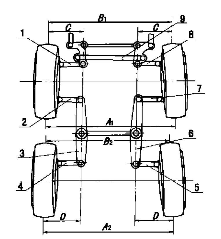 包头522车、青山522改型车为8轮驱动,第1、2桥为同比转向驱动桥(前后车轮转向角度完全相同)。