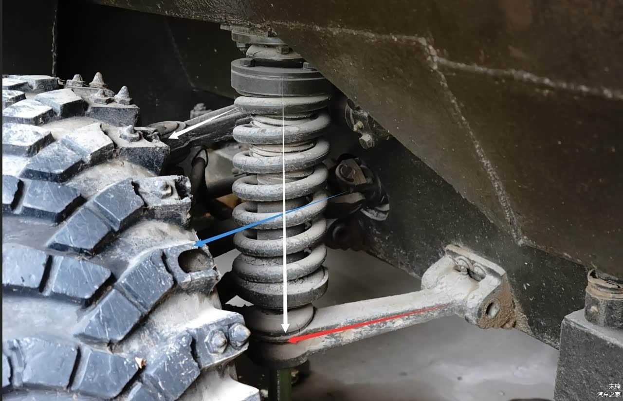 蓝色箭头:下端固定在下A型摆臂的减震器总成