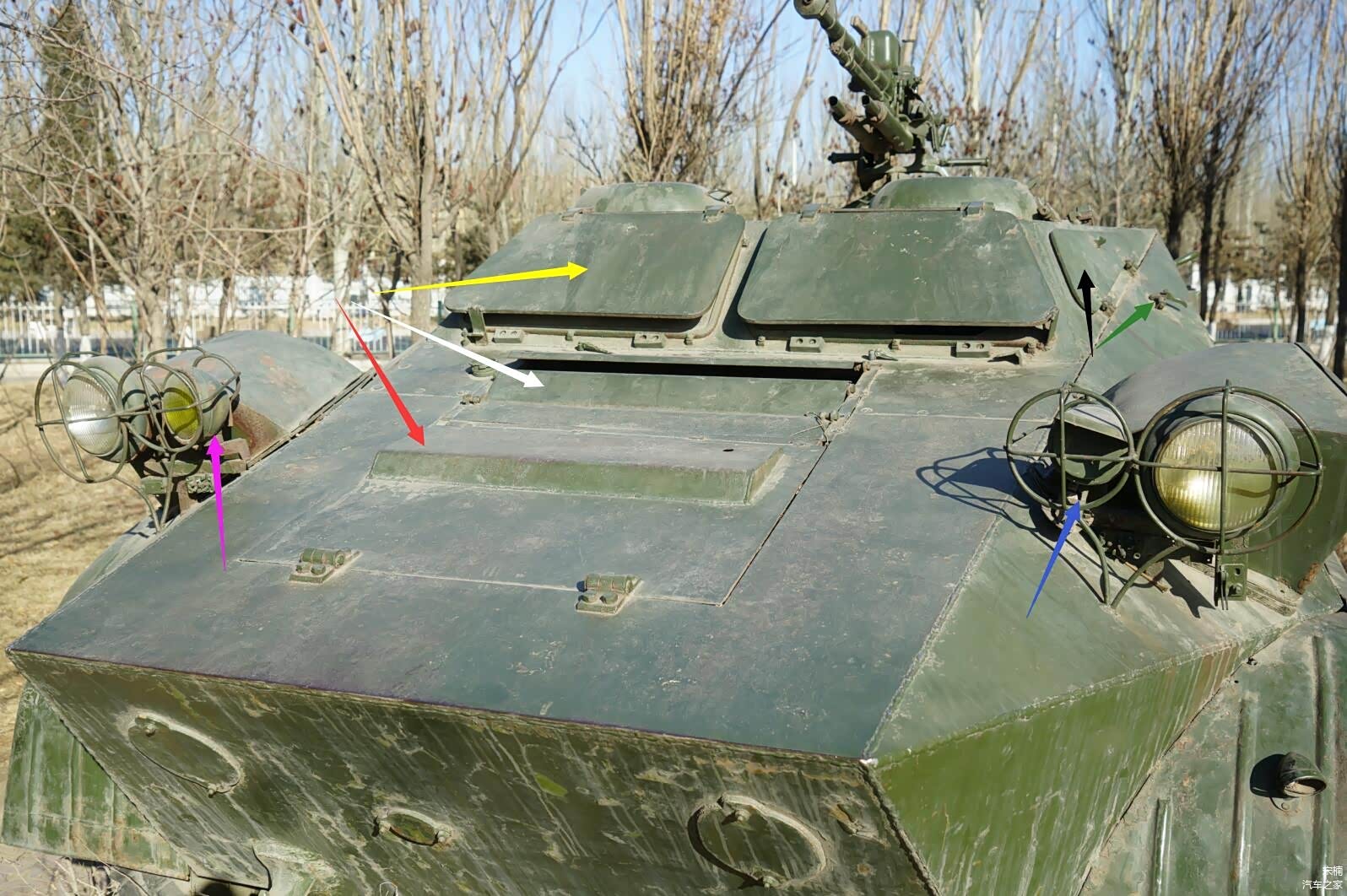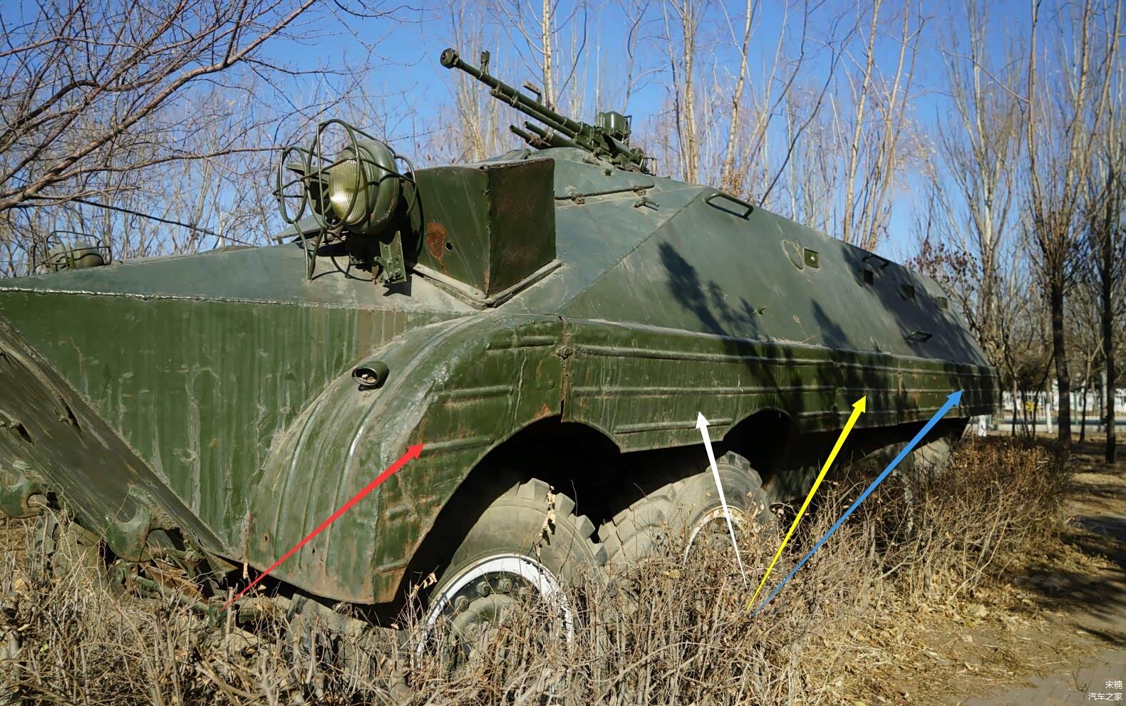 在防护上,522车的首上装甲(红色箭头)、首下装甲(白色箭头)以及侧向装甲(黑色箭头)构成角度较为平均的被弹姿态。首上、下装甲角度相近,没有形成苏军BTR-60或70那样平直的首上装甲、大被弹角度的首下装甲(虽然这种设定有利于两栖行驶姿态)设定。