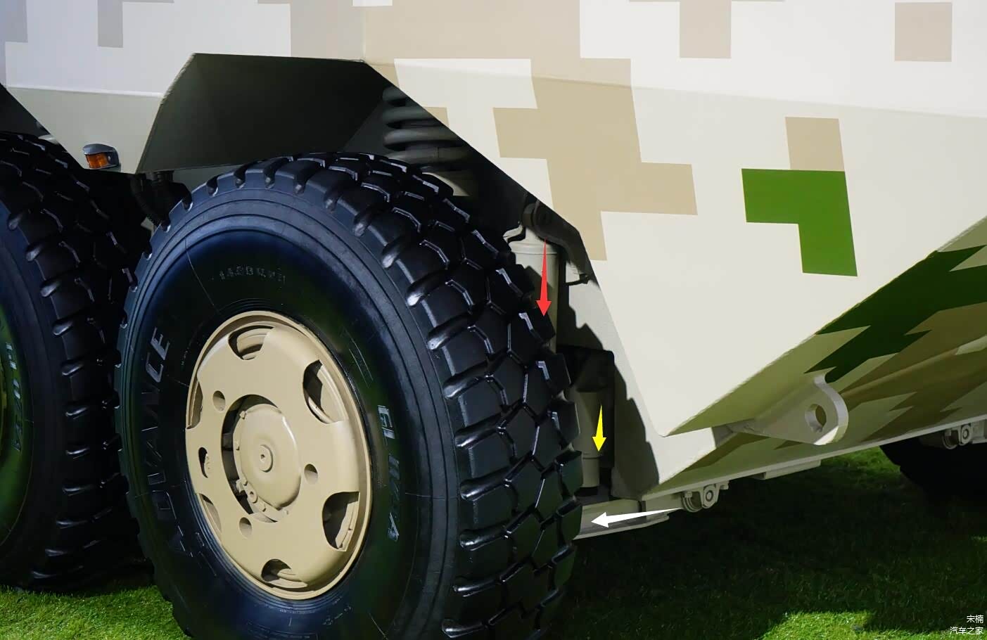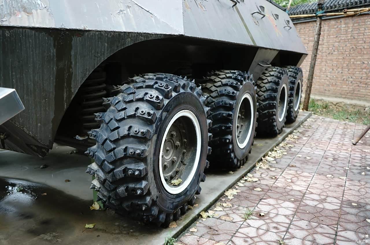 上图为青山522改型车行走机构特写。很明显,第1转向驱动桥车轮为传统越野胎,第2转向驱动桥和第3、4驱动桥轮胎则使用523型轮履合一装甲车一样的带有胎钉,并可匹配特殊履带的轮胎。