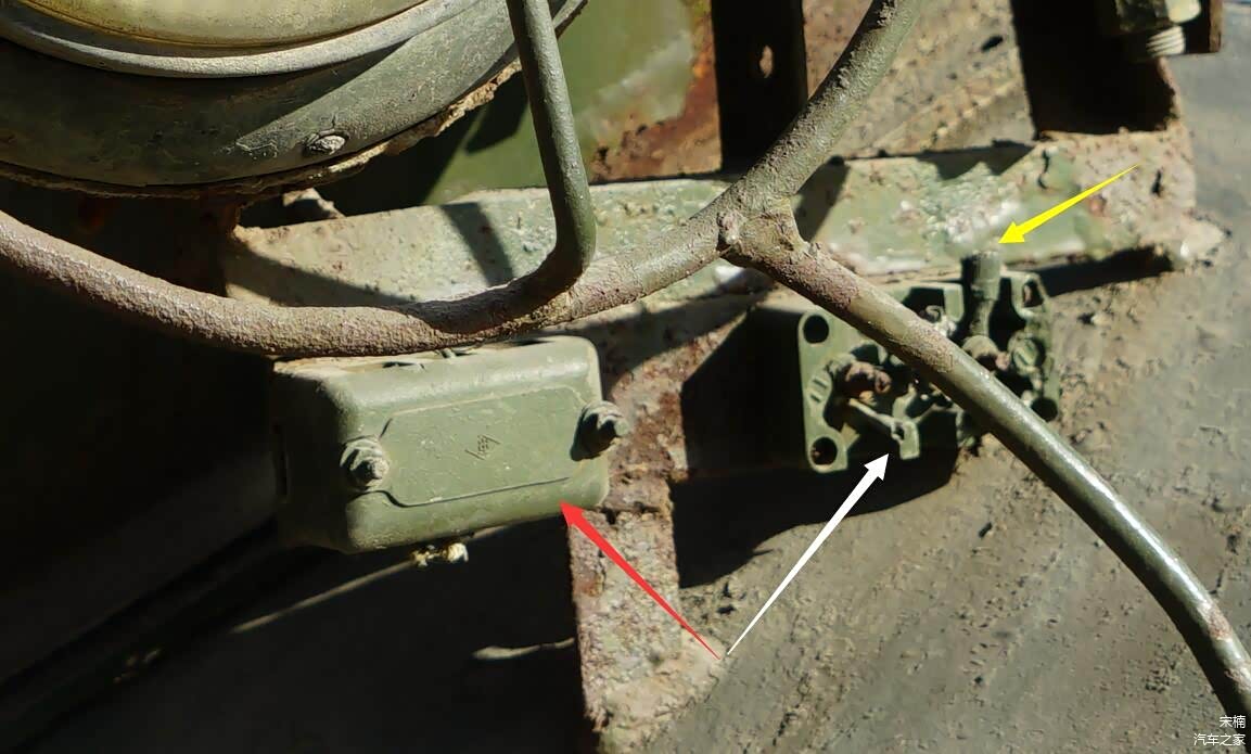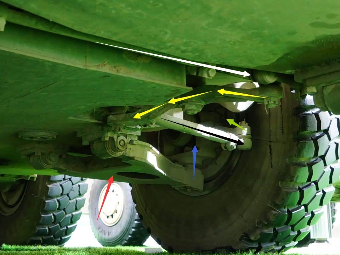白色箭头:连接第1、2驱动桥的转向拉杆