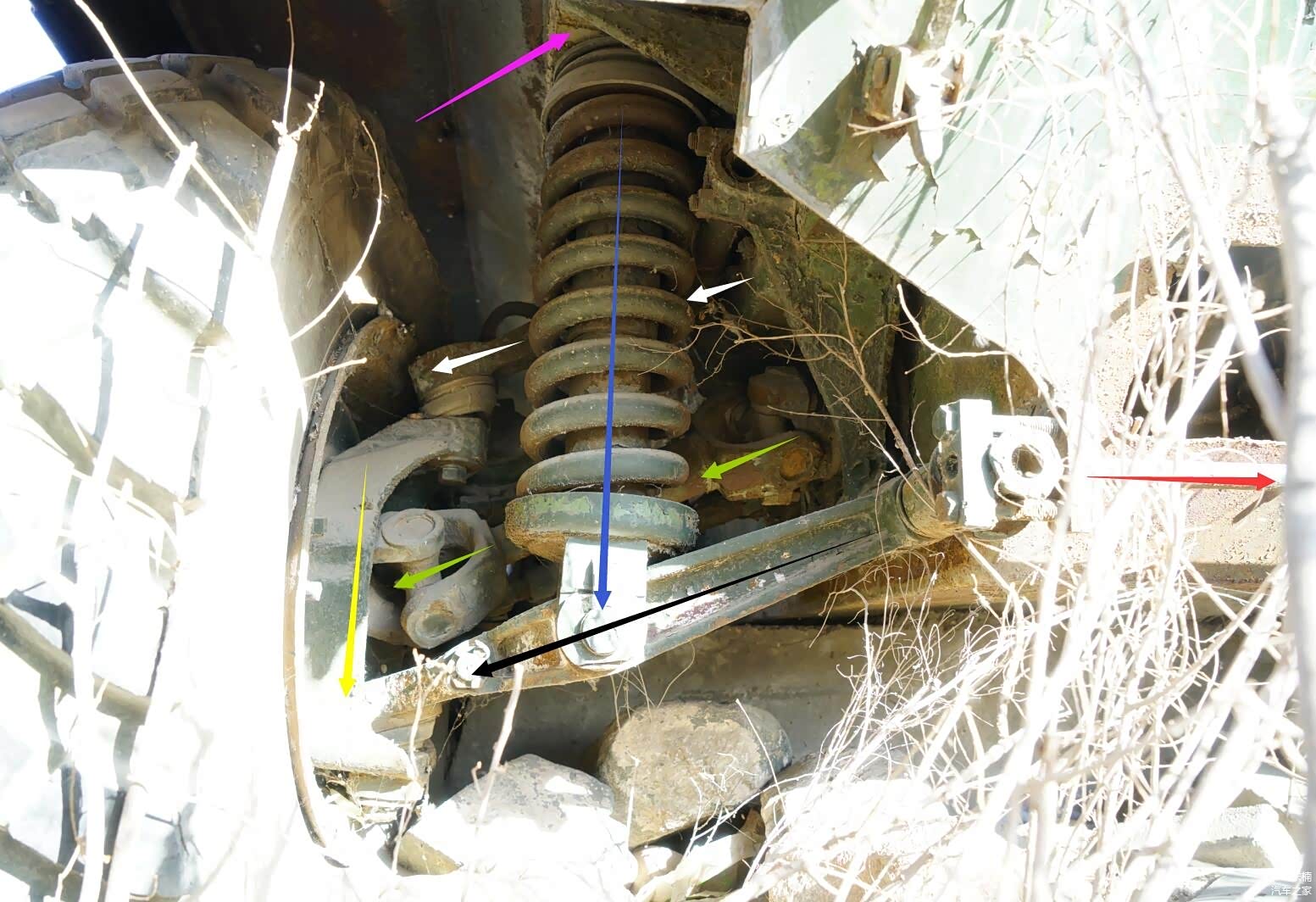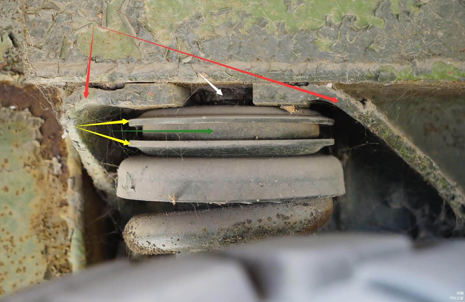 粉色箭头:前减震器总成(含螺旋弹簧)上固定端