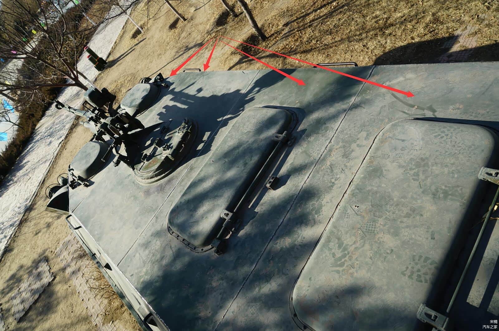 从青山522改型车动力舱细节研判,取消了及动力舱两端进气道和排气管,排气管改为中部顶端引出,经载员舱右侧和左侧至车尾(红色箭头),采用单排双出结构。