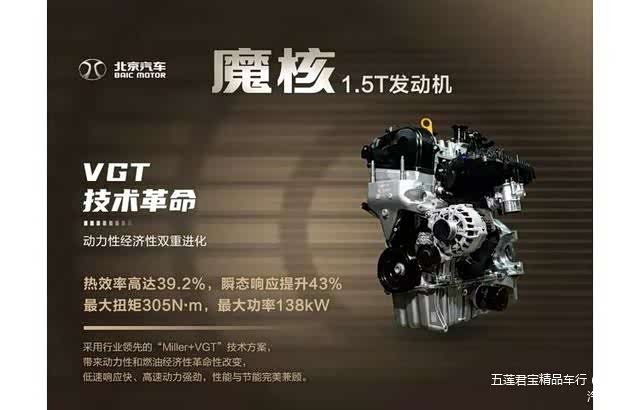 跟上面的广汽传祺矩浪1.5T一样,北京汽车这台魔核1.5T也相当暴躁,得益于VGT可变截面废气涡轮增压器的应用,这台发动机能够有效避免固定截面涡轮存在的低速迟滞问题,从而兼顾低转速动力响应和高转速动力爆发。官方数据显示,这台发动机热效率达到39.2%,,动力响应速度比常规“带T”提升了43%,同时在1500rpm可以达到305牛米的峰值扭矩。