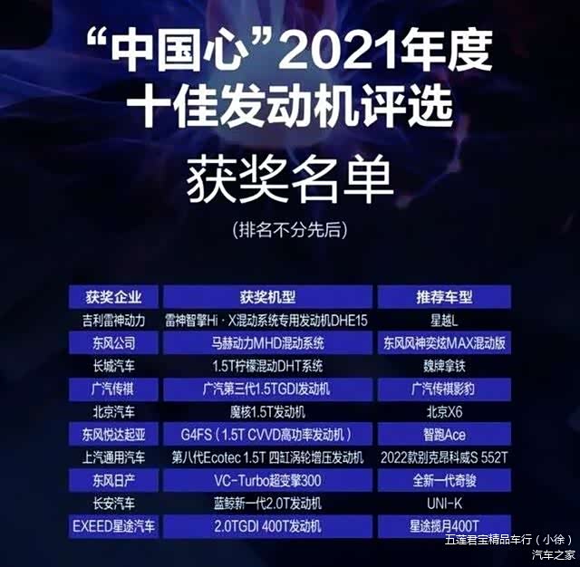 通过组委会对中国市场50款汽车的统一标准评测,11月8日,“中国心”2021年度十佳发动机评选结果揭晓,其中包含了三款自主车企的最新研发的混动系统,四款自主车企的全新发动机,而上汽通用、东风日产、现代起亚则用自家的1.5T发动机占了三个席位。今天我们就来看看,这十台新玩意儿究竟有多少“含金量”。