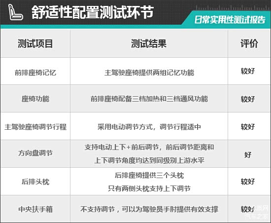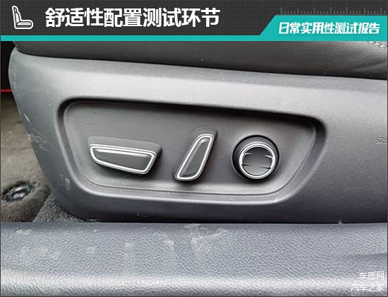 评测车的主/副驾驶座均采用电动调节,并选装了前排座椅加热和通风功能,以及主驾驶座记忆功能,配置达到同级别主流水平。座椅调节按键位于座垫侧面,操作起来比较顺手。值得一提的是,评测车依旧保留了老款车型上经典的“老板键”,后排乘客可通过按键控制副驾驶座椅前后移动和调节靠背角度,以获得充足的后排空间。