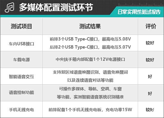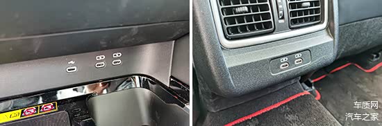 评测车共配备了5个USB Type-C接口,其中,前排3个接口位于中控台下方,后排2个接口位于后排空调出风口下方,布局较为合理,不过兼容性一般。此外,前排中央扶手箱内部还提供了1个12V电源接口。