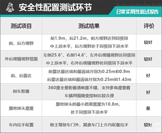 在车辆前、后方视野测试中,车内所有座椅均已调整至最低状态,所测出的数据与驾驶者正常使用时均有一些偏差,仅供参考。