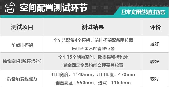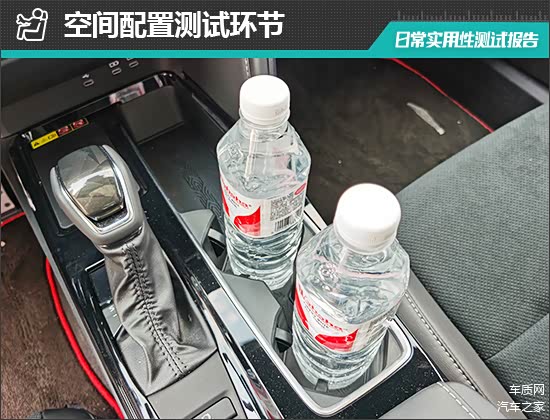 对于车内使用空间的测试,只针对前排触手可及的空间,不包括手套箱、中央扶手箱等需开启的空间。测试方法是将以下固定物品全部放置在前排的各个储物空间内,通过固定物品的放置情况来判断车辆储物空间的表现。测试选定的固定物品为:2瓶常规大小的矿泉水、1部大屏手机、1支口红、1个挎包、1副墨镜、1把折叠雨伞以及1包常规尺寸的抽纸。