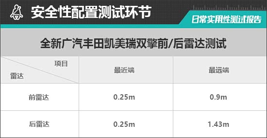 雷达测试过程中,评测车的后雷达最远可在1.43m处感应到后方物体,后雷达功率表现不错。参考往期测试经验,持续蜂鸣阶段越接近0.25m则越贴近日常使用习惯,从实测数据来看,后雷达持续蜂鸣阶段最远距离为0.25m,与测试经验值完全吻合。