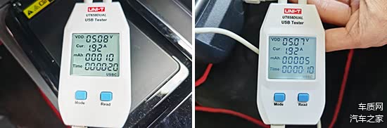 同时,我们对各个USB接口的电压与电流进行了测试,前排接口的最高电压为5.08V,最高电流为1.92A;后排接口的最高电压为5.07V,最高电流为1.92A。