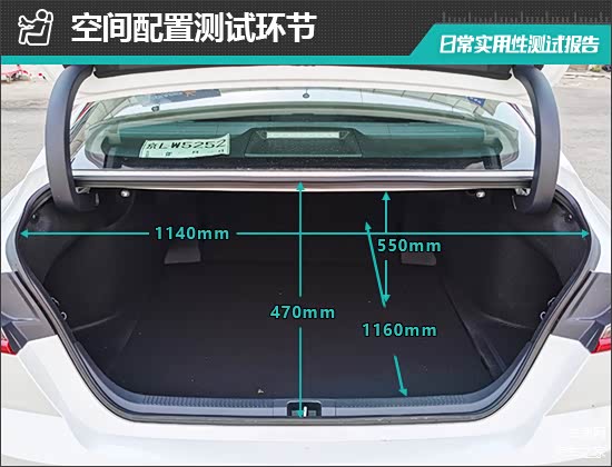 对于后备厢基础数值,我们也进行了实测,开口长度为470mm;开口宽度为1140mm;后备厢进深为1160mm;后备厢地板与内部车顶的垂直高度为550mm。