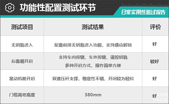对于消费者来说,门槛离地高度一定程度上决定了上下车便利性。根据实测结果来看,评测车的门槛离地高度为380mm,成绩优于此前测试过的同级别车型,驾乘人员日常上下车非常方便。