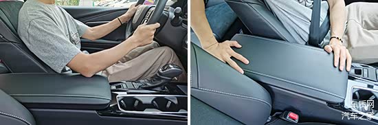 前排中央扶手造型规整且尺寸较大,表面采用皮质包裹,枕靠舒适性不错。中央扶手虽然不支持前后移动和角度调节,不过驾驶者在驾驶过程中依然可以将肘部搭在上面。