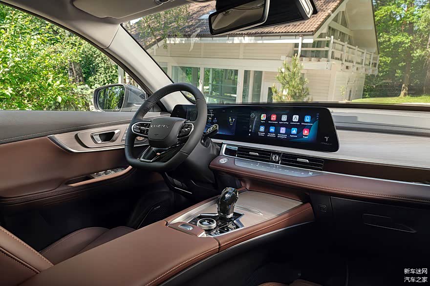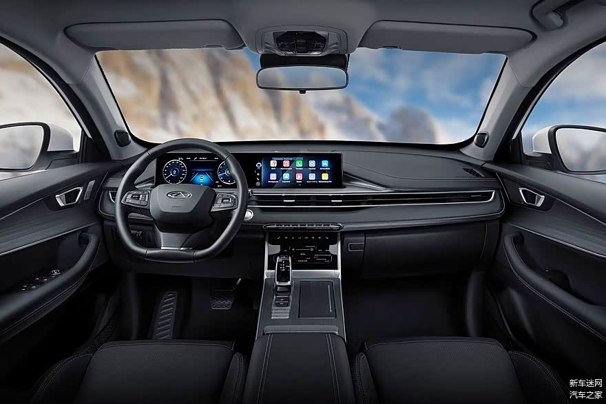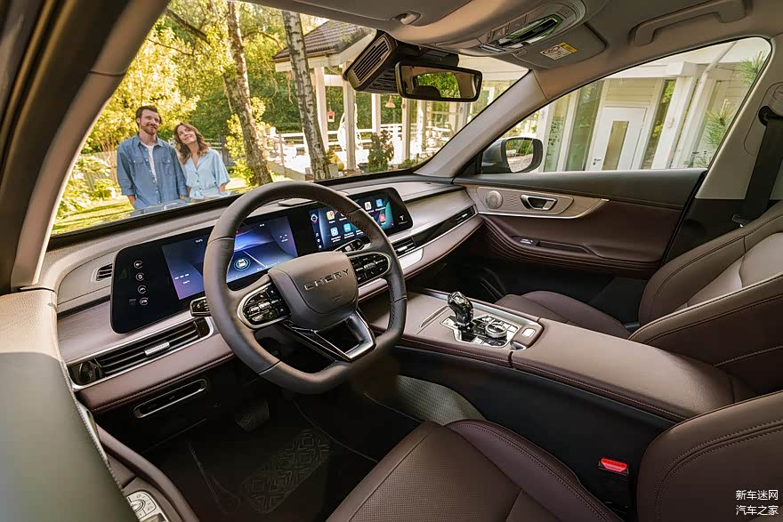 新款奇瑞瑞虎7 Pro Max的内饰融合了瑞虎7 Plus的设计风格,配备了双联屏(12.3英寸仪表盘和中控触摸屏)、贯穿式空调出风口、平底方向盘、虎头标电子挡把等。在中央通风口下方有一排触摸按钮,用于控制空调。中控台也进行了重新设计,看起来十分简洁。最后,内饰采用深棕色“皮革”装饰(现款瑞虎7 Pro采用黑色内饰)。