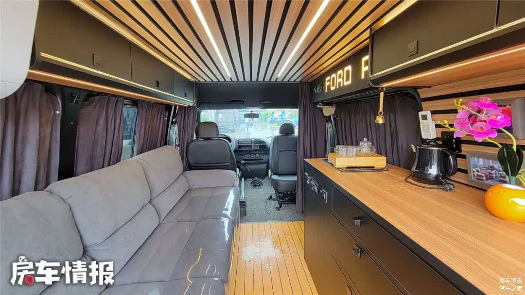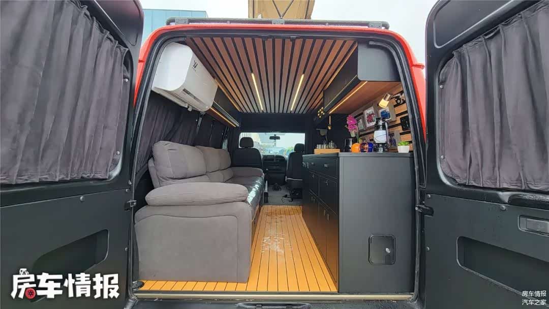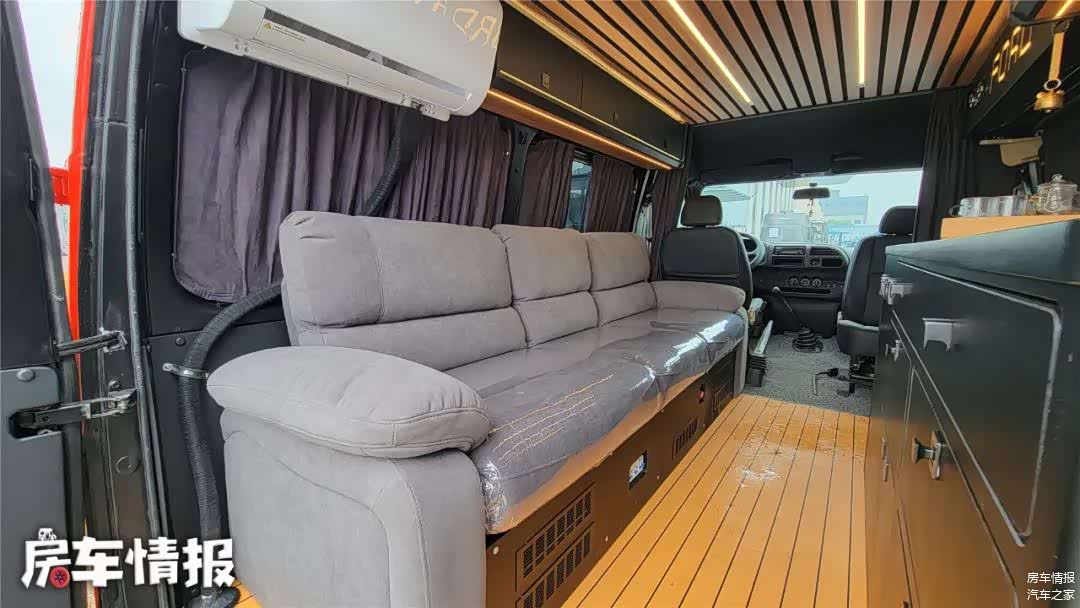 当然啦,对于这款车最重点的部分就是生活区的改造,由于是老板自己的车辆,所以内部全部按照个人喜好以及使用需求来订,内部采用了国外非常流行的Vanlife风格,上下实木装饰加条形灯带,在搭配上深灰色的软装,整体给人的感觉非常不错。