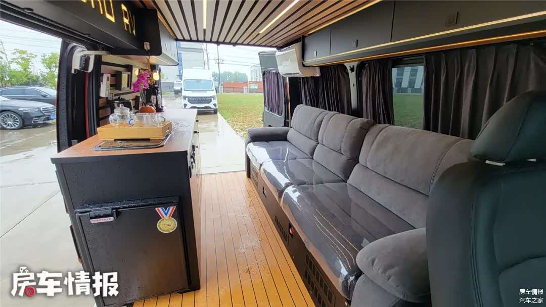 另外内部也没有采用常规的房车布局,而是采用了一个非常通透的设计,由于取消了固定床和卫生间的原因,生活区的空间感非常不错,主要休息区采用的是一组三人沙发,整体乘坐舒适性也很棒,柔然亲肤的沙发材质,称作起来和家里的沙发完全一样。