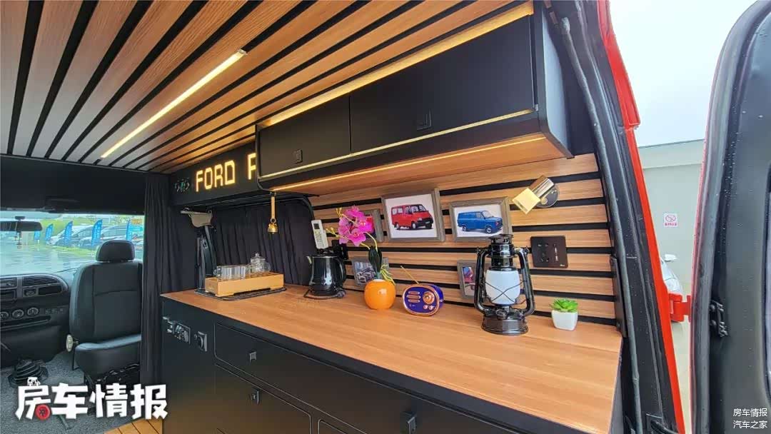 车厢右侧还提供了侧边柜,可以用来放置物品、吃饭、做饭甚至是办公使用,由于内部空间很宽敞,所以2-3个人在车内活动完全不用担心拥挤。