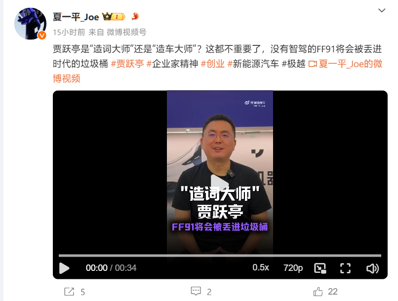 6月27日,极越汽车CEO夏一平通过视频表达对贾跃亭及其“理念”的看法。“贾跃亭‘老师’造了很多让人匪夷所思的产品名词,除此之外没有什么特别大的创新。”