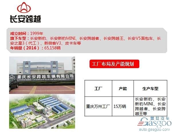 重庆长安跨越汽车生产基地位于重庆市万州区天子工业园,目前已占地400余亩,生产车型包括:长安新豹、长安新豹MINI、长安跨越者、长安跨越王、长安V5面包车、长安之星3(代工)、新微客V3、皮卡车等。