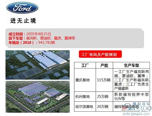 长安福特第一、二、三工厂分别于2004、2012、2014年在重庆投产,第四工厂于2015年在杭州投产。据了解,目前三家重庆工厂年产能达115万辆,杭州工厂年产25万辆。此外,长安福特第五工厂(哈尔滨)也已于2015年正式启动,并于2017年2月前后投产,预计产能为20万辆,新工厂将生产长安福特旗下福克斯等车型。值得一提的是,这一新工厂正是在2015年被长安福特收购的哈飞汽车的生产基地,根据了解,其从2016年下半年开始生产长安福特旗下乘用车,加之其目前基本无销量,可以说其已基本沦为长安福特的代工厂。