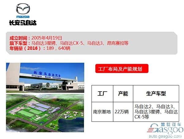 长安马自达南京工厂占地1935亩,总投资54亿元,现有产能为22万辆,厂内包括冲压车间、焊装车间、涂装车间以及总装车间。目前主要生产马自达2、马自达3、马自达3星骋以及马自达CX-5。