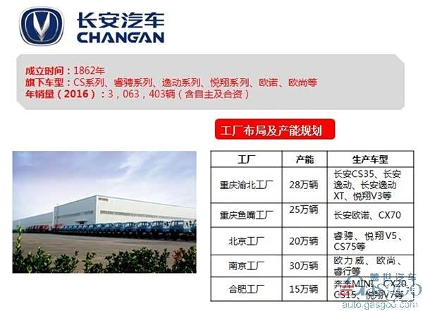 长安汽车目前在国内有重庆、北京、河北、合肥、南京等众多生产基地。其中,重庆、北京、合肥三大工厂为乘用车生产基地:重庆渝北工厂产能最大为28万辆;北京工厂产能2015年达到20万辆;合肥工厂设计产能为15万辆,并在近几年有望提升至25万辆左右。其余基地则负责以MPV和微车组成的长安商用车系的生产工作。另据了解,长安在2015年新建重庆新工厂,年产能为24万辆,最大生产能力可达到36万辆/年。新工厂将利用长安的P3平台,投产C201、C301系列车型。
