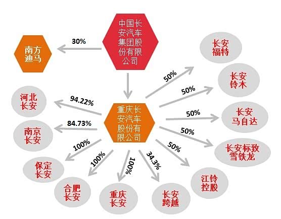 目前,长安集团旗下所属整车汽车有:重庆长安汽车股份有限公司(以下简称“长安汽车”,其与福特、铃木、马自达、标致雪铁龙、江铃等分别建有合资公司)、重庆南方迪马专用车股份有限公司(以下简称“南方迪马”)。值得一提的是,尽管该集团官网仍将哈尔滨哈飞汽车工业集团有限公司(以下简称“哈飞汽车”)列为成员单位,但在2015年,哈飞汽车已被长安福特正式收购。