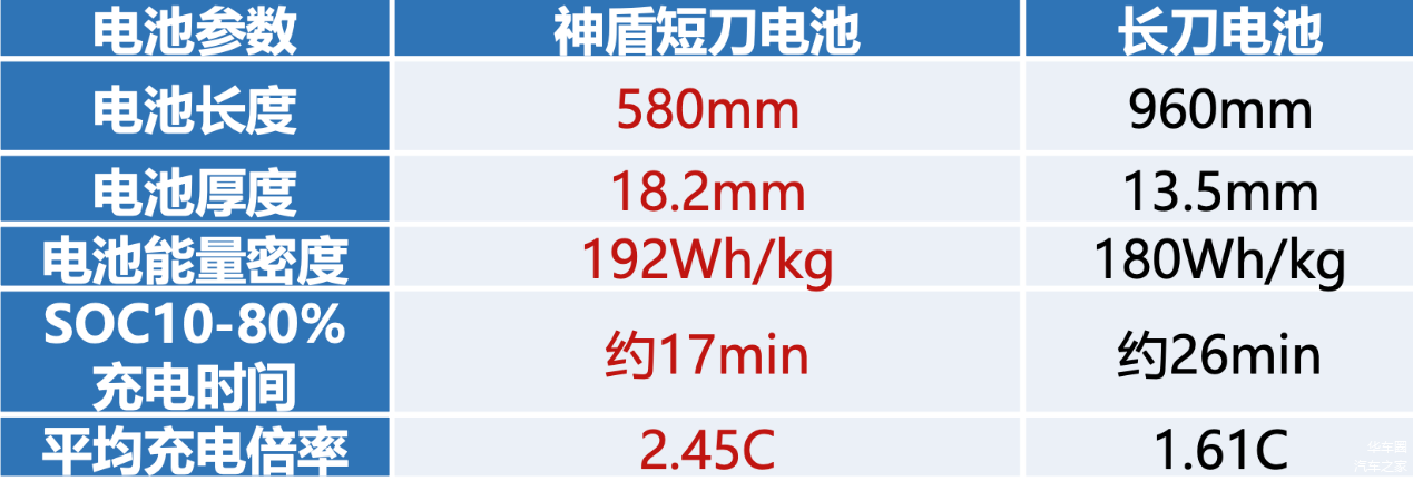 从参数上看,神盾短刀电池优势十分明显。能量密度达到192wh/kg,高于长刀电池的180wh/kg;从10%到80%的充电时间仅17分钟,快于长刀电池的26分钟,快充速度是长刀的1.5倍;平均充电倍率2.45C,远高于长刀电池的1.61C。