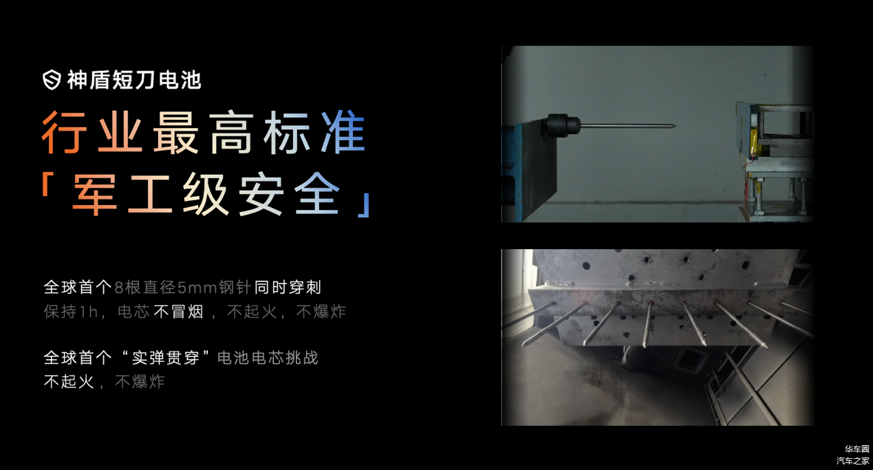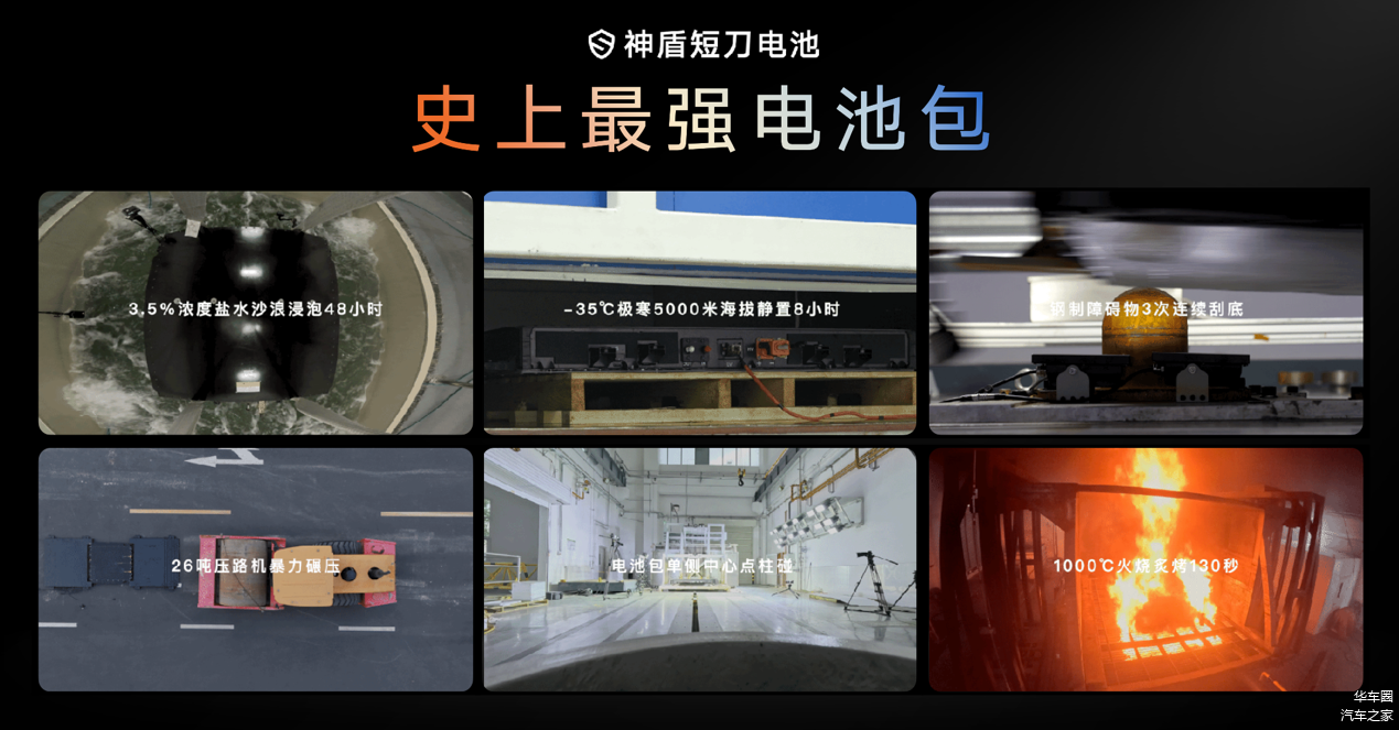 除此之外,同一电池包,连续通过动态海水腐蚀浸泡、高原极寒、高频次刮底、26吨超重往复式碾压、单包侧柱碰、烈焰炙烤6大“魔鬼”串行试验,神盾短刀电池也全部以超国标的优异成绩通过中汽中心测试,进一步夯实神盾短刀电池的性能和安全性,更为整个行业树立了“安全新标杆”。