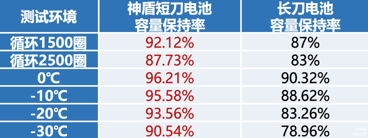 公布的实验数据显示,神盾短刀电池在循环2500圈后,电池容量可达87.73%,而长刀电池仅循环1500圈,电池容量就已衰减至87%。神盾短刀电池在零下30度气温中,电池仍可保持90.54%的使用电量,远高于长刀电池的78.96%。