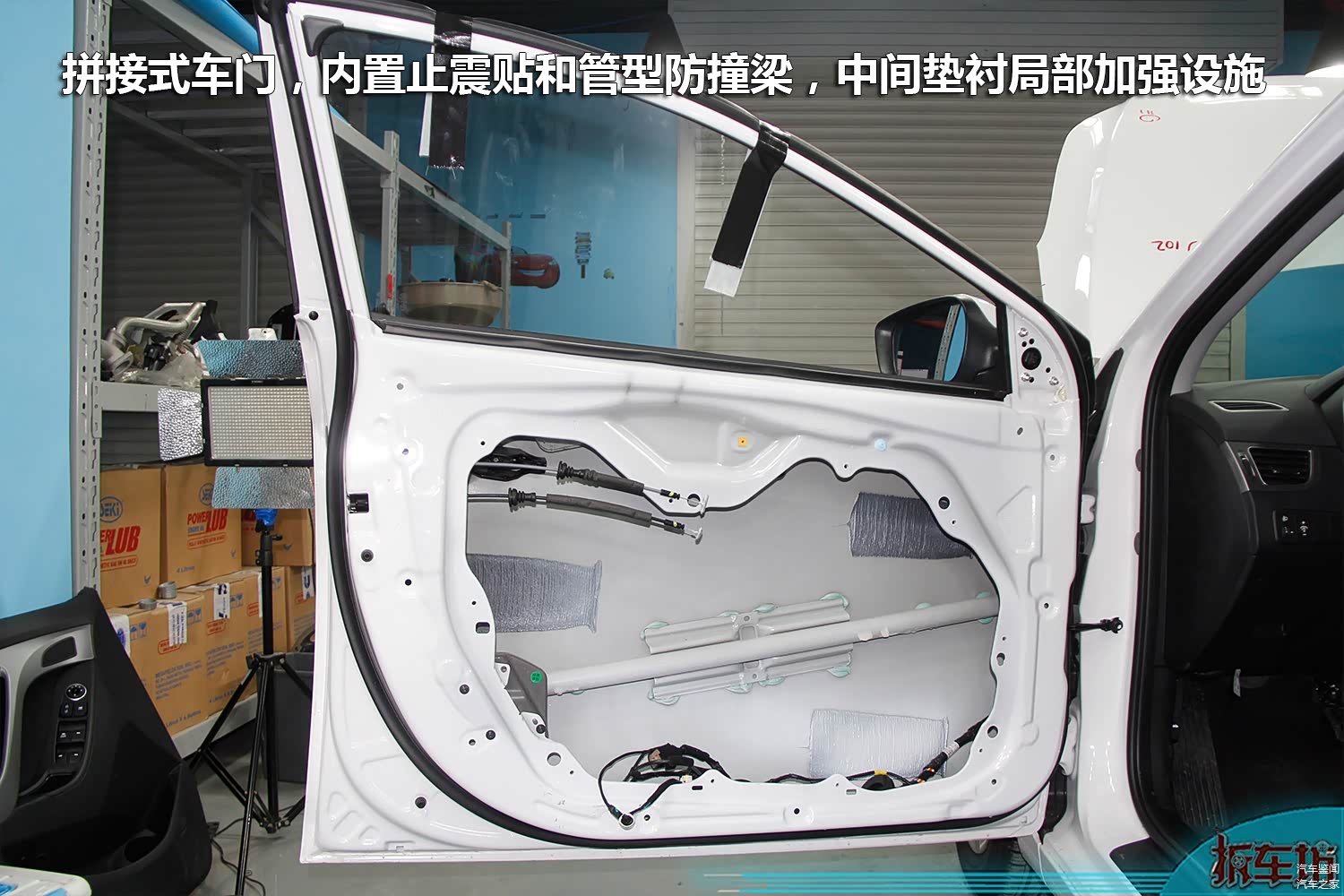全新朗动采用了拼接式车门,前车门内部设置了一根管型防撞梁,在管梁中部设置了支撑装置,填满门皮到管梁之间的空隙,减少门皮钢板的振动。