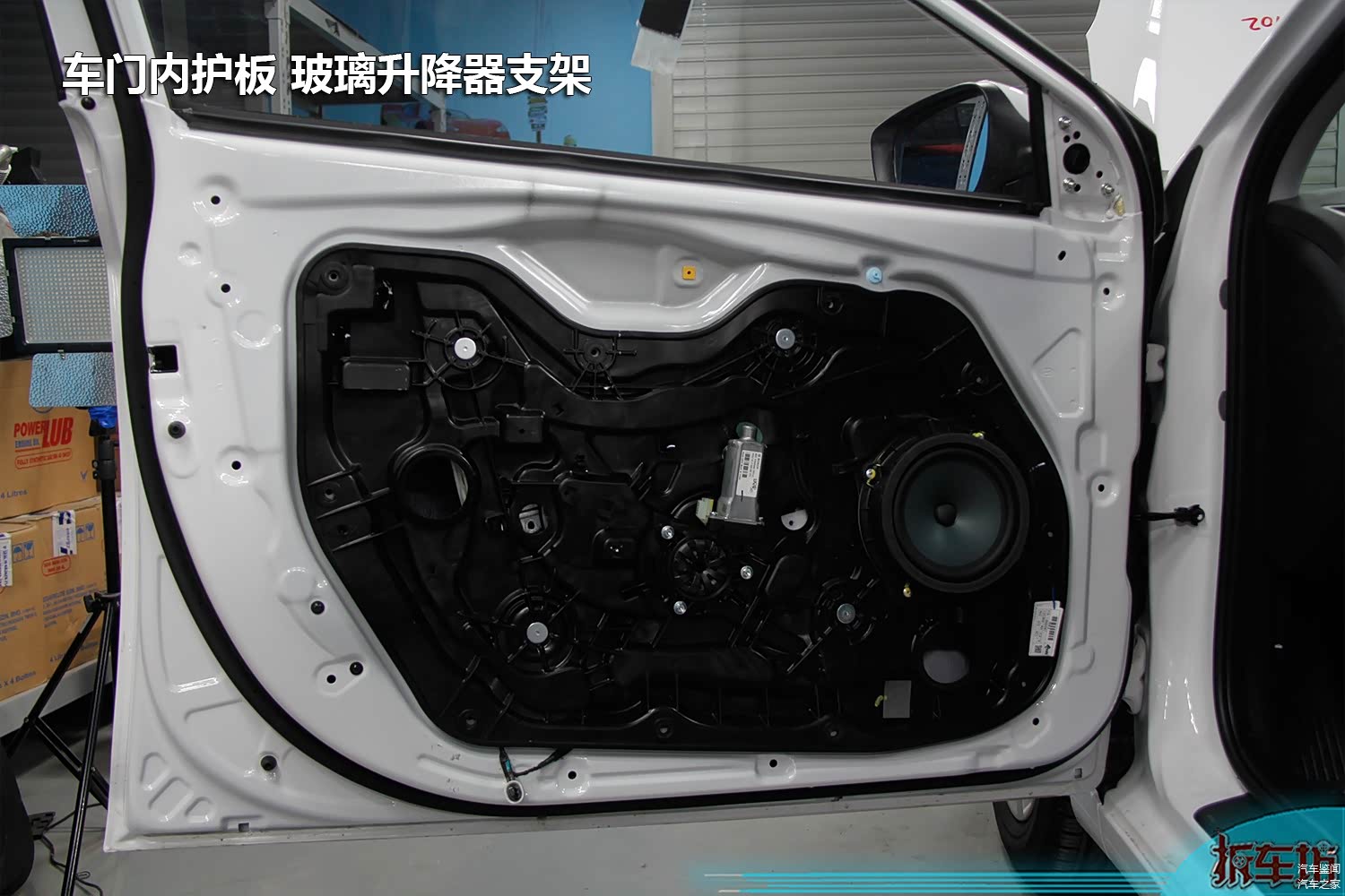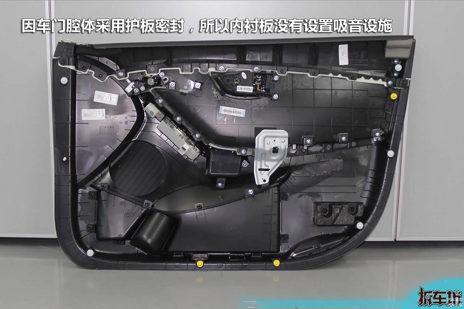 因为前车门采用了非金属护板密封车门腔体,因此省去了防水布和车门内衬板常见的吸音材料。