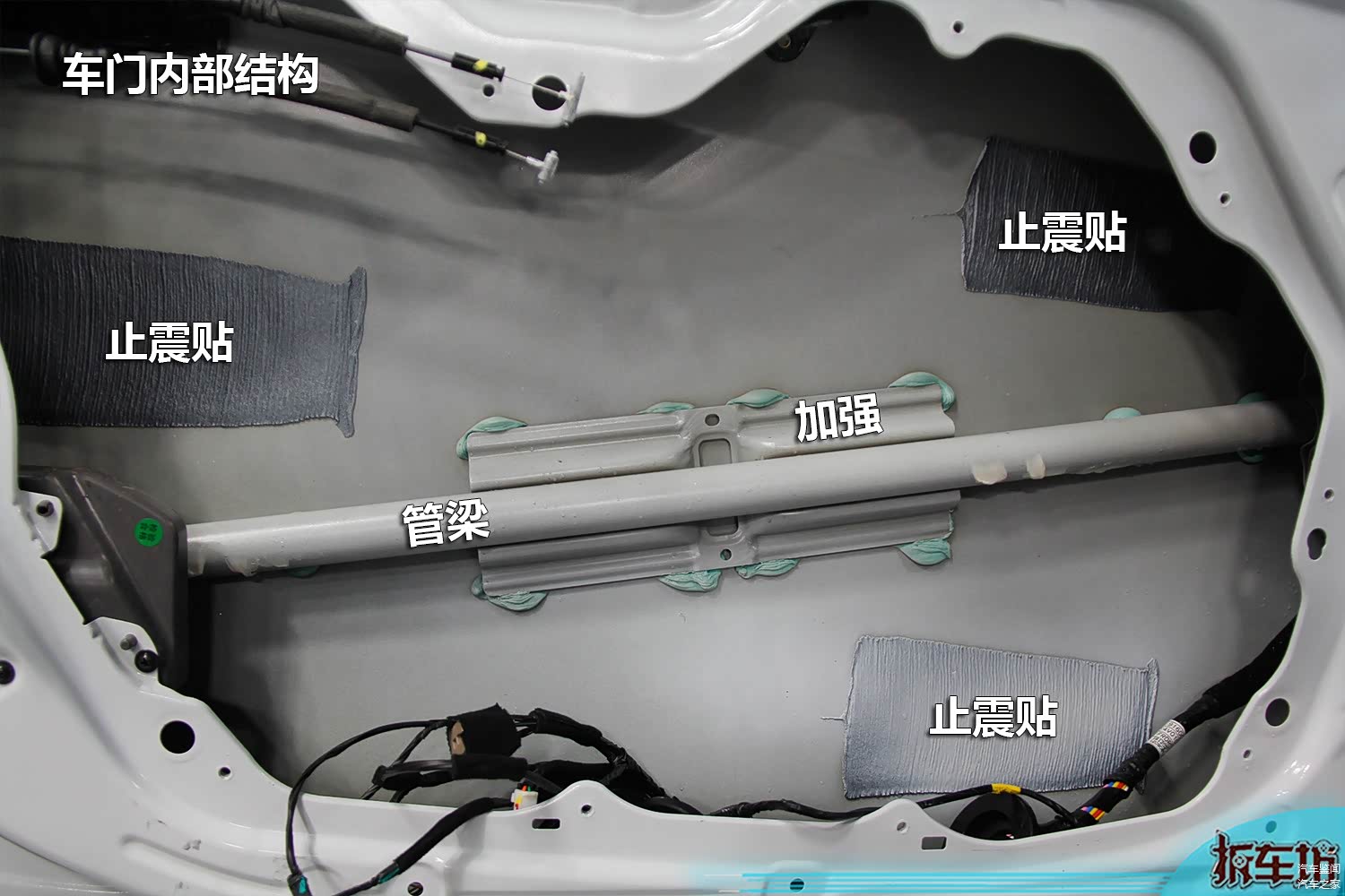另外为了进一步提高车门外皮的强度,还设置了几块止震贴,避免行驶中的振动引发门皮跟着振动。